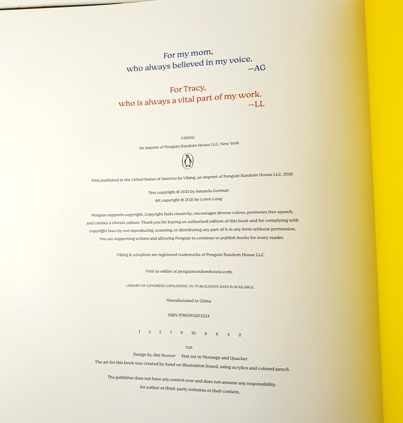 First Edition signed by Amanda Gorman (certified by JSA). Viking (Penguin), New York 2021.